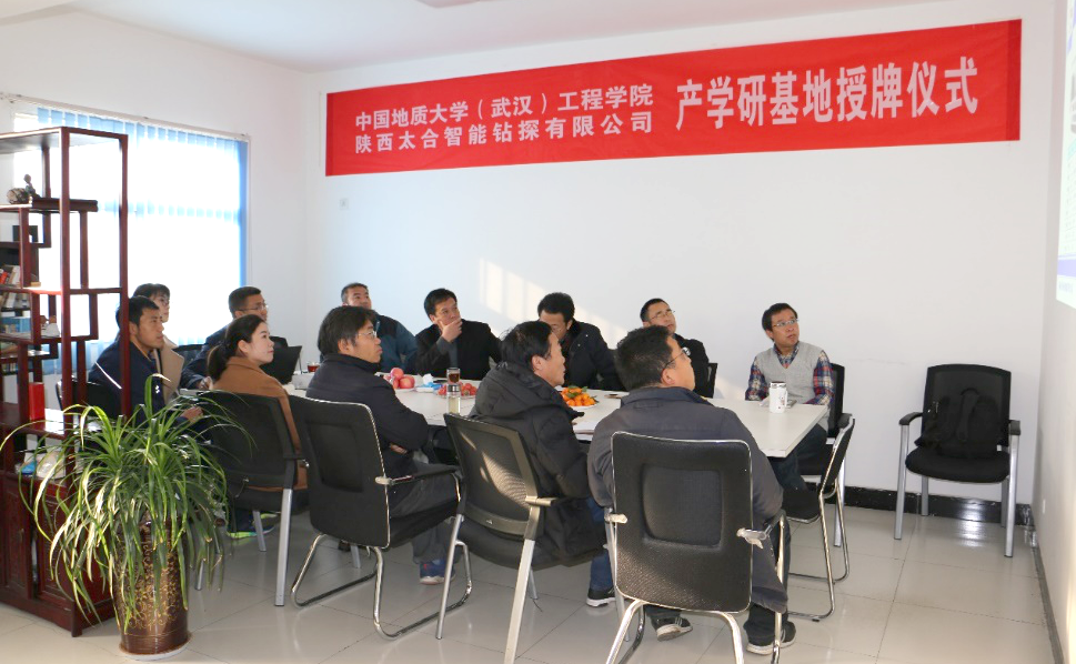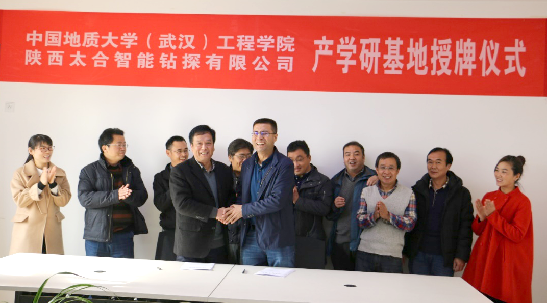中国地质大学电竞比赛下注平台(中国)官方网站党委书记陈飞、副院长窦斌以及勘查与基础工程系段隆臣书记、胡郁乐教授、陕西太合智能钻探有限公司董事长王义红、钻探工艺部部长石明善、机械研发部技术总监薛向宇、生产工艺部部长彭腊梅、仪器研发部部长杨英男和液压总工程师邓代传等十余人出席此次签约仪式。