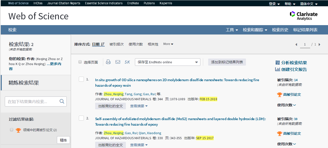 基本科学指标数据库(Essential Science Indicators,简称ESI)最新数据显示,安全工程系周克清老师发表的论文“In situ growth of 0D silica nanospheres on 2D molybdenum disulfide nanosheets: Towards reducing fire hazards of epoxy resin”入选高被引论文。该论文是周克清老师以中国地质大学(武汉)电竞比赛下注平台(中国)官方网站为第一单位、第一作者和通讯作者身份发表的第2篇ESI高被引论文。2018年7月周克清老师发表的论文“Self-assembly of exfoliated molybdenum disulfide (MoS2) nanosheets and layered double hydroxide (LDH): Towards reducing fire hazards of epoxy”曾同时入选ESI高被引论文和热点论文。