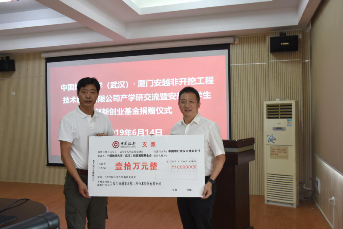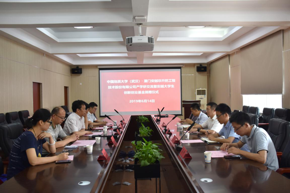 2019年6月14日上午,厦门安越非开挖技术股份有限公司来校作产学研交流,并捐赠10万设立安越大学生创新创业基金,捐赠仪式在315举行。厦门安越非开挖技术股份有限公司董事长廖宝勇一行、武汉中地大非开挖研究院有限公司总经理孔耀祖,校友工作与教育基金管理处副处长吕占峰、丁苗苗,电竞比赛下注平台(中国)官方网站党委书记陈飞、党委副书记江广长、副教授曾聪参加会议。江广长主持会议。