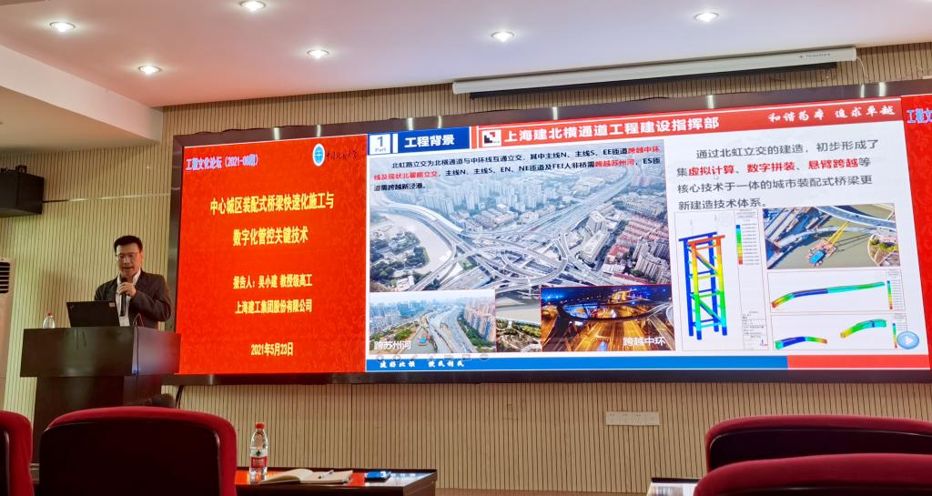 (通讯员 梁荣柱)2021年5月23日下午,应电竞比赛下注平台(中国)官方网站院长焦玉勇教授和梁荣柱副研究员的邀请,上海建工集团股份有限公司工程研究总院副院长、中国地质大学(武汉)兼职教授吴小建教授级高级工程师作客2021年第8期工程文化论坛,作“中心城区装配式桥梁快速化施工与数字化管控关键技术”专题报告。电竞比赛下注平台(中国)官方网站副院长窦斌教授代表学院对吴小建教高的到来表示欢迎,并介绍了吴小建教高的基本科研和工作履历。讲座由梁荣柱副研究员主持,约一百名师生参与报告会。