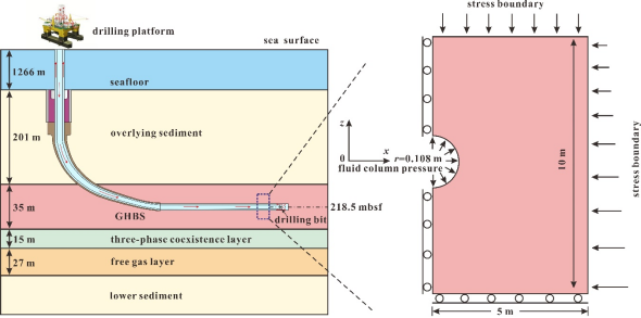 鉴于此,中国地质大学(武汉)电竞比赛下注平台(中国)官方网站宁伏龙教授团队根据南海神狐海域第一次试采站位的地质资料,构建了水合物储层水平井钻进状态模型(图1)。详细研究了不同钻井液性能、水合物饱和度以及束缚水饱和度对钻进过程中井筒状态的影响规律。并在此基础上,讨论了井筒内二次水合物生成的潜在区域以及低渗泥皮形成对井壁稳定的影响。