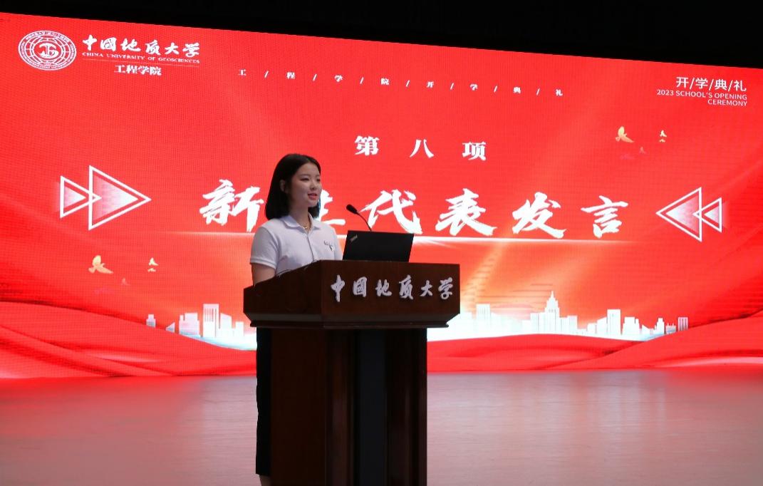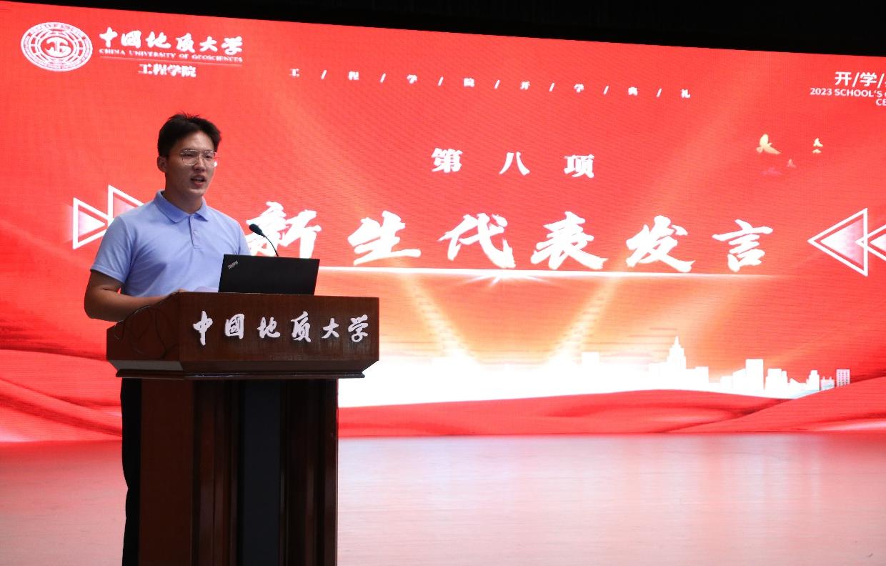 2023级05D231班张高涵同学作为本科生新生代表发言。他说,在长辈厚重岩土气息的熏陶下,自己终于如愿考进地质大学,加入电竞比赛下注平台(中国)官方网站。他对开学报到以来学院领导老师给予的教育关怀表示感谢,对军事训练当中空军预警学院教官对自己坚忍毅力和良好作息的打造由衷感激,他立志与其他505名本科新生同学一道,以强国建设、民族复兴的时代号召为号角,以“品德高尚、基础厚实、专业精深、知行合一”的成才目标为向导,直挂云帆,乘风破浪,早日成为德智体美劳全面发展的中国特色社会主义事业的建设者和接班人。