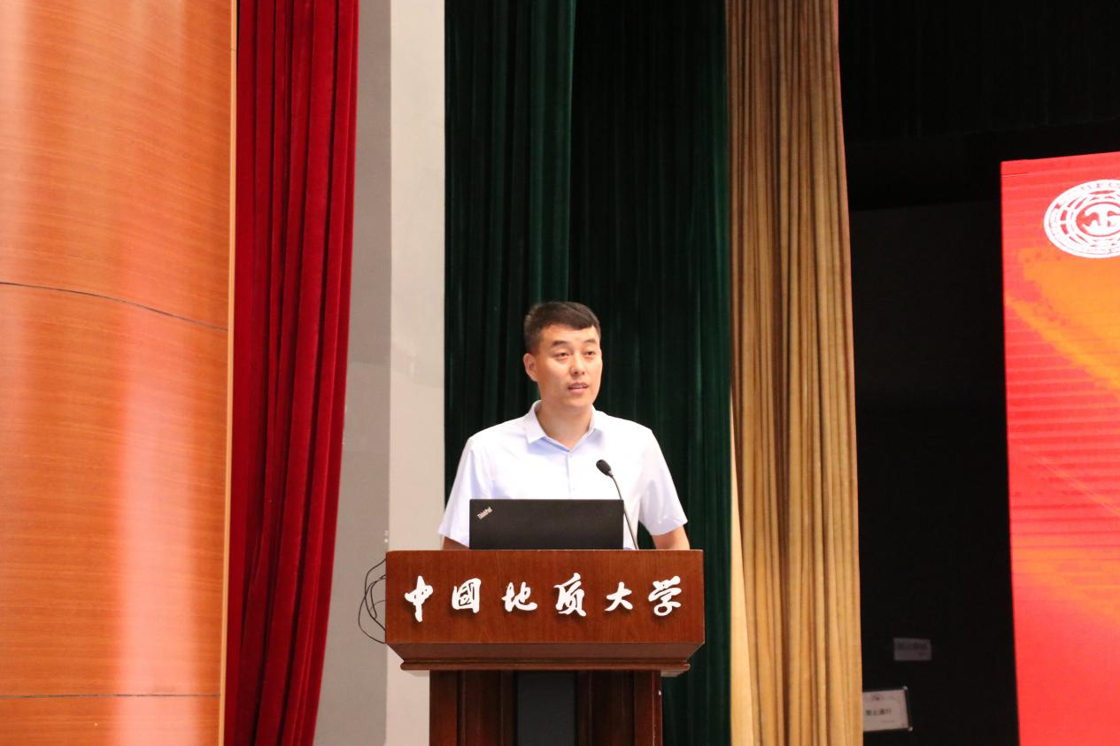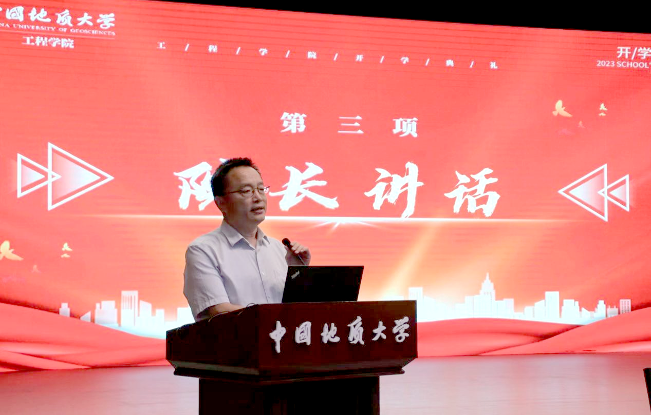 电竞比赛下注平台(中国)官方网站院长焦玉勇教授讲话。他以“祝贺”“欢迎”“希望”寄语新生,祝贺860位新生加入国家工程行业,欢迎同学们来到中国地质大学电竞比赛下注平台(中国)官方网站,为学院发展注入新鲜血液、增添奋进力量。他系统全面的向大家介绍了学院的历史沿革、系室设置、师资力量、学科建设、科学研究、国际交流等基本情况,勉励全体新生用习近平新时代中国特色社会主义思想凝心铸魂,用“艰苦朴素,求真务实”的校训精神和“明理尚实、拓新砺行”的院训精神领航前进,跟随学校学院的发展步伐,用好学校学院的发展平台,毅然投身于国家工程建设行业当中,迎难而上、奋勇前行,不负历史、不复时代,为把学院建设成为地质工程与人居安全领域特色鲜明、享誉国际的一流研究型学院不懈努力!