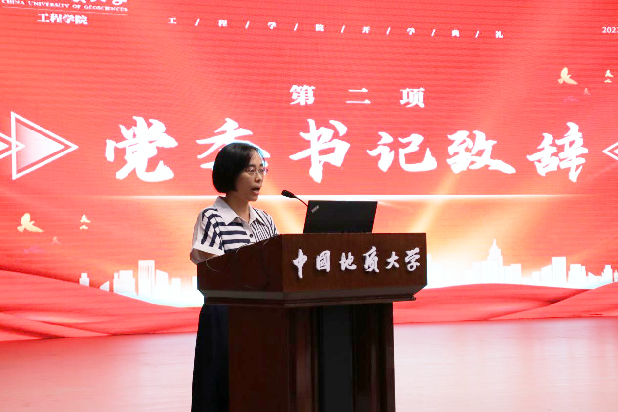 电竞比赛下注平台(中国)官方网站党委书记李红丽致辞。李书记首先代表全院师生员工对加入电竞比赛下注平台(中国)官方网站的860名新成员致以热烈的欢迎,祝福同学们选择了电竞比赛下注平台(中国)官方网站这个温暖而又奋进的大家庭。她指出,当代大学生正值云程发轫、万里可期的青春韶华,要全面学习学院的辉煌历史,深刻感受学院的使命担当,铭记院训深意,争做时代栋梁。要“明理”,即明辨是非,通晓道理,要明白做人之理、为学之理、尊法之理;要“尚实”,即崇尚务实作风,要在实处用力,在知行合一上下功夫;要“拓新”,即开拓创新,要面向世界科技前沿、面向经济主战场、面向国家重大需求、面向人民生命健康,解放思想,开拓创新,与时俱进;要“砺行”,即砥砺前行,在攻坚克难中磨砺心性,坚守初心,锻造本领,成长成才。她勉励同学们以院训精神为指引,树牢远大志向、矢志不懈奋斗,努力学习,潜心科研,乐观开朗,积极向上,做堪当时代大任的新时代地大工程人,为建设社会主义现代化国家做出属于青年一代的贡献。