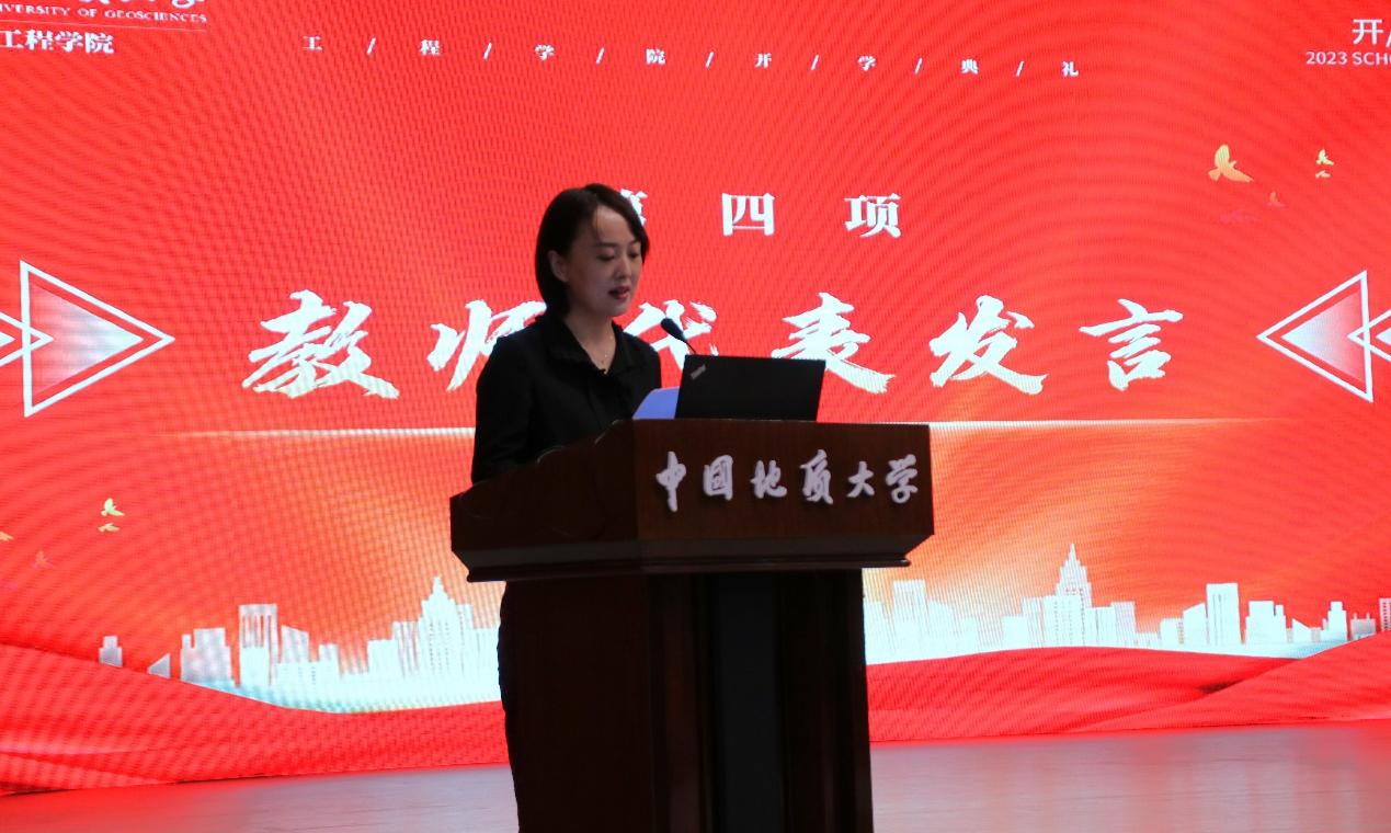 工程地质与岩土工程系教师吴琼作为教师代表发言。她以一名入学20年的“学姐”身份向各位新生分享自己的求学经历、教学经历、科研经历,从本科生到博士生,从硕士生导师到博士生导师,从职场小白到再取得一项项骄人的教学科研成果,风雨彩虹、铿锵玫瑰,她用自己的亲身经历书写着一名女性地质工程者向上攀登、步履不停的奋进史,为全体新生树立“真榜样”,帮助全体女生吃下学好工程专业的“定心丸”。吴琼老师寄语新生,要以理想者、担当者、吃苦者、奋斗者的姿态立足新时代、奋进新征程,创造新业绩、诠释正青春。