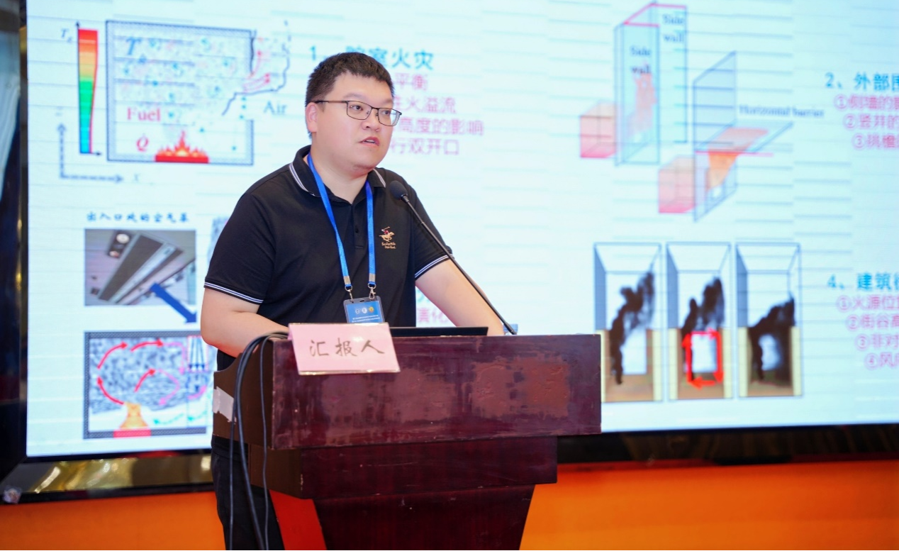 陆凯华副教授围绕“复杂边界条件下建筑火灾及溢流行为研究”做特邀主题报告。针对复杂边界条件下建筑火灾及溢流行为展开,相关研究揭示了建筑腔室火灾烟气输运及填充特征、间歇性火溢流临界判据,阐述了不同开口、外墙结构、空气幕等条件下的开口火溢流特性与物理主控机制,并讨论了不同环境风条件下羽流在高层建筑冠层的回卷行为与动力学判据,建立了典型参数的体系化表征模型。研究有助于科学指导高层建筑防火设计和外立面火蔓延阻隔技术发展,提升建筑本质生命力。