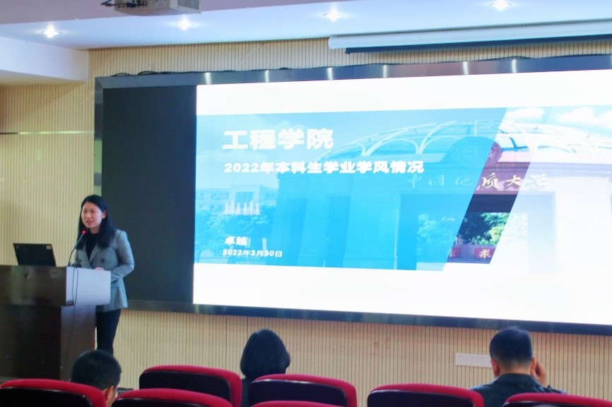 辅导员卓越老师介绍全院本科生学业学风情况。她对学院全体本科生的考试成绩作了深入的分析,将各年级存在的问题进行了梳理,对产生原因进行了剖析,指出了学院本科生学业方面面临的共性问题,重点通报了学院近期出现的学业预警情况。