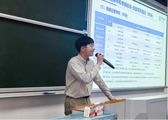 2024级辅导员彭友元介绍《中国地质大学(武汉)电竞比赛下注平台(中国)官方网站“优良学风示范班”创建评选办法》。他从“优良学风示范班”总体要求、创建流程、考核指标、奖惩办法等四个方面进行介绍,重点解读了班级政治理论学习、遵纪守法与文明修养、集体观念、班级制度建设、班级干部表现等5项班级综合表现指标,课堂出勤、早操出勤、课堂表现、作业完成情况、自习组织情况等5项班级日常学风指标,平均学分绩点、优秀率、及格率和英语四级通过率等4项班级课程成绩指标,以及学生参加科技创新活动等附加分项目指标。他要求同学们仔细阅读创建办法文件,对照量化评估考核指标,积极开展富有班级特色的学风建设活动。